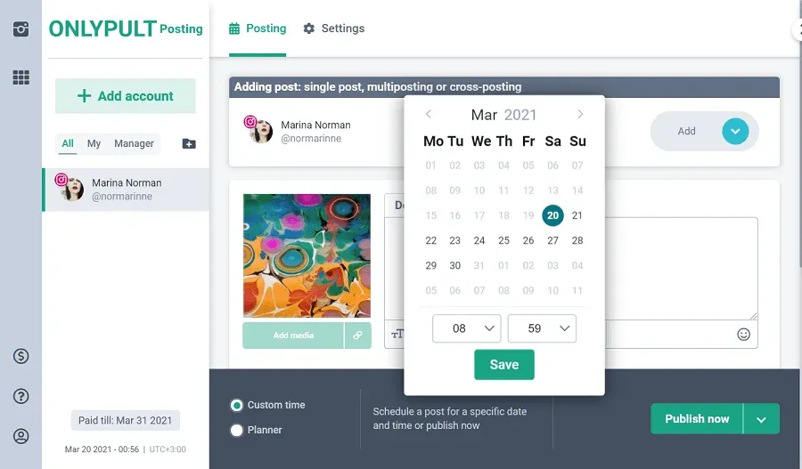 Programmation de publications et de reposts avec personnalisation de la description et choix de l’heure.