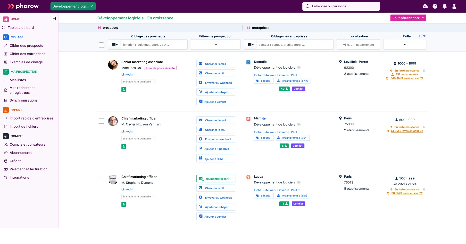 Boostez votre performance commerciale avec Pharow : l’outil de prospection ultime pour startups, PME et grands groupes. Grâce à son interface intuitive, ses fonctionnalités avancées, et sa capacité de personnalisation, Pharow simplifie et optimise chaque étape de votre cycle de vente. Découvrez une solution fluide, efficace, et parfaitement intégrable à votre écosystème technologique. Faites le choix d’un support client réactif pour une expérience sans faille. Cliquez pour transformer votre stratégie commerciale !