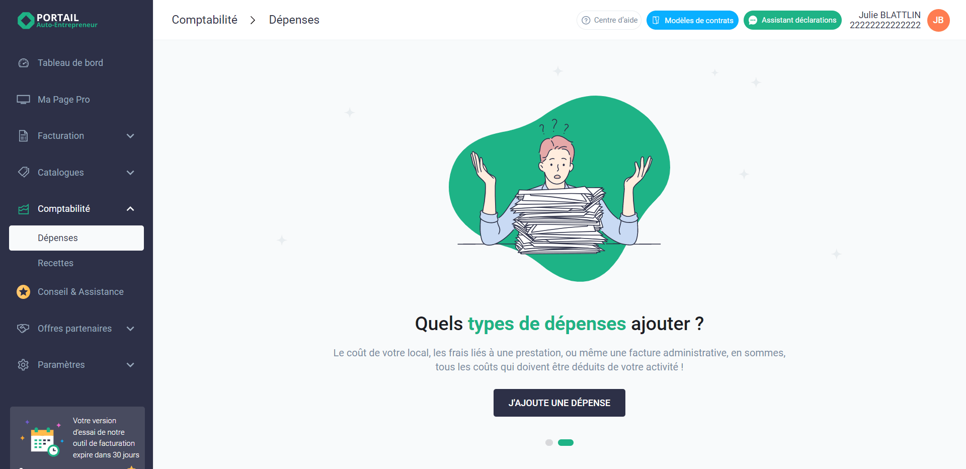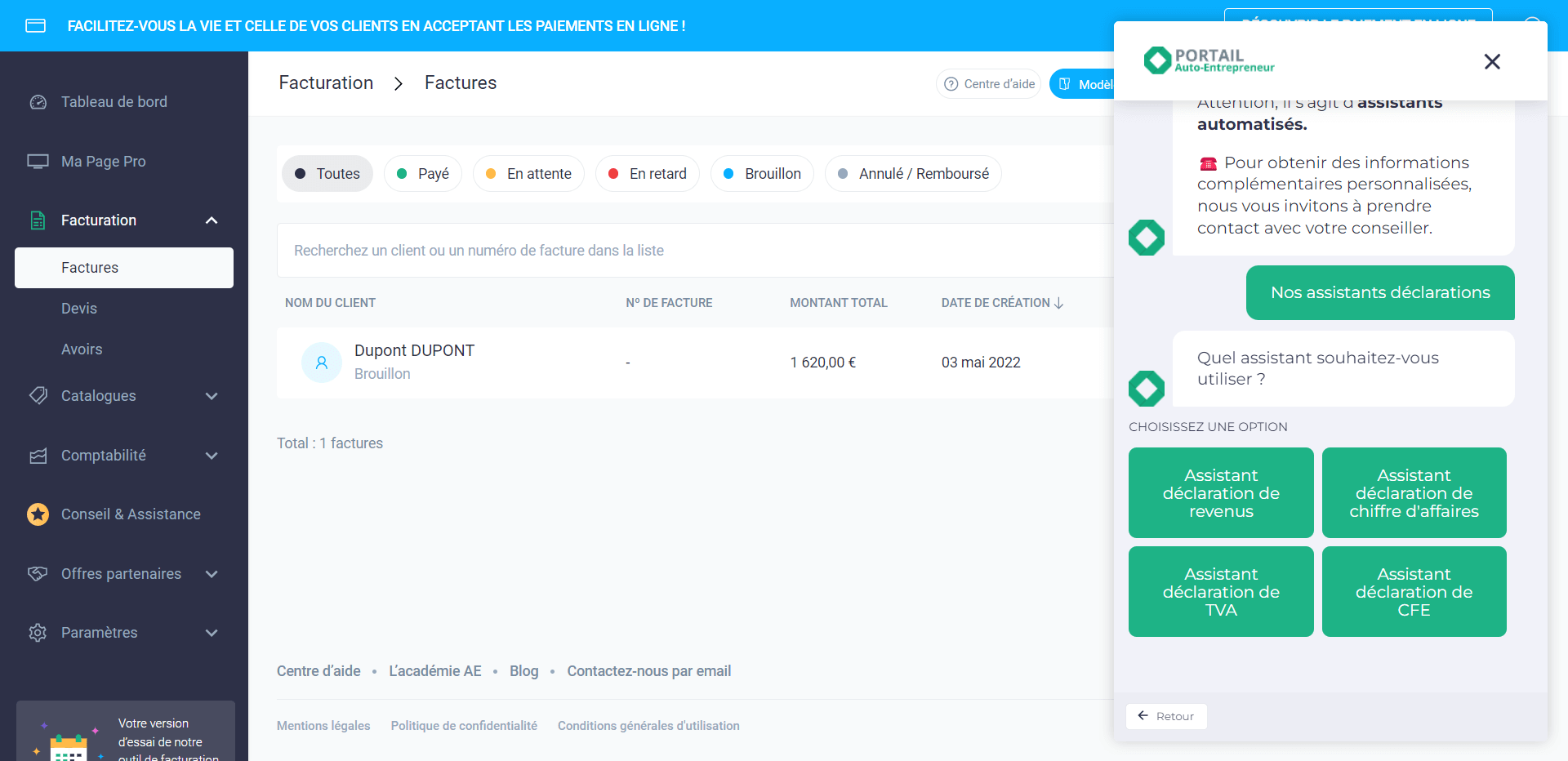 Pour un accompagnement complet, et une gestion simplifiée de vos démarches administratives, vous trouverez un assistant automatisé pour vos différentes déclarations officielles (déclaration de chiffre d’affaires, déclaration de revenus, TVA et CFE).