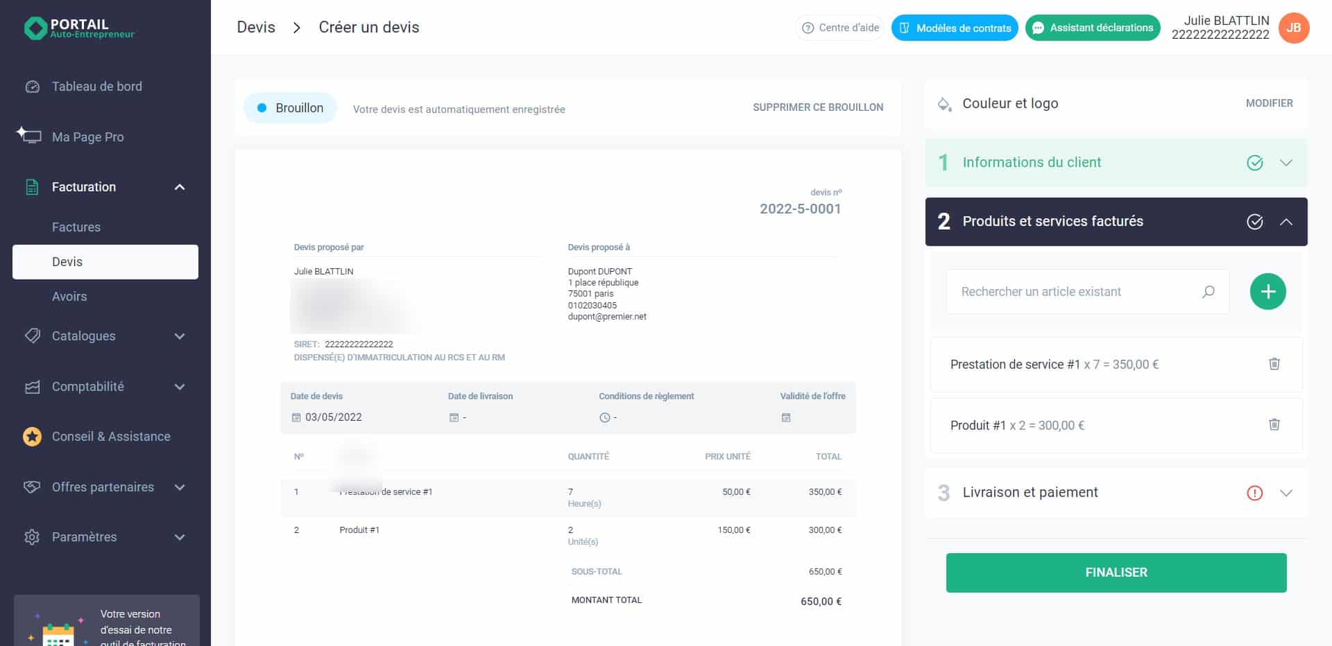 Avec l’outil de gestion de Mon Portail, vous réalisez en quelques clics des devis, des factures et des avoirs comportant toutes les mentions obligatoires et utiles.