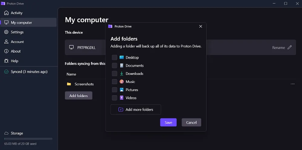 Une application dédiée pour Windows permet de synchroniser n’importe quel dossier de l’ordinateur avec le cloud. Les fichiers sont chiffrés avant d’être importés. Toute modification locale (ajout, suppression, modification) est automatiquement répercutée dans le cloud. Il est également possible de sauvegarder des fichiers par glisser-déposer ou via un bouton d’importation dans l’application web.