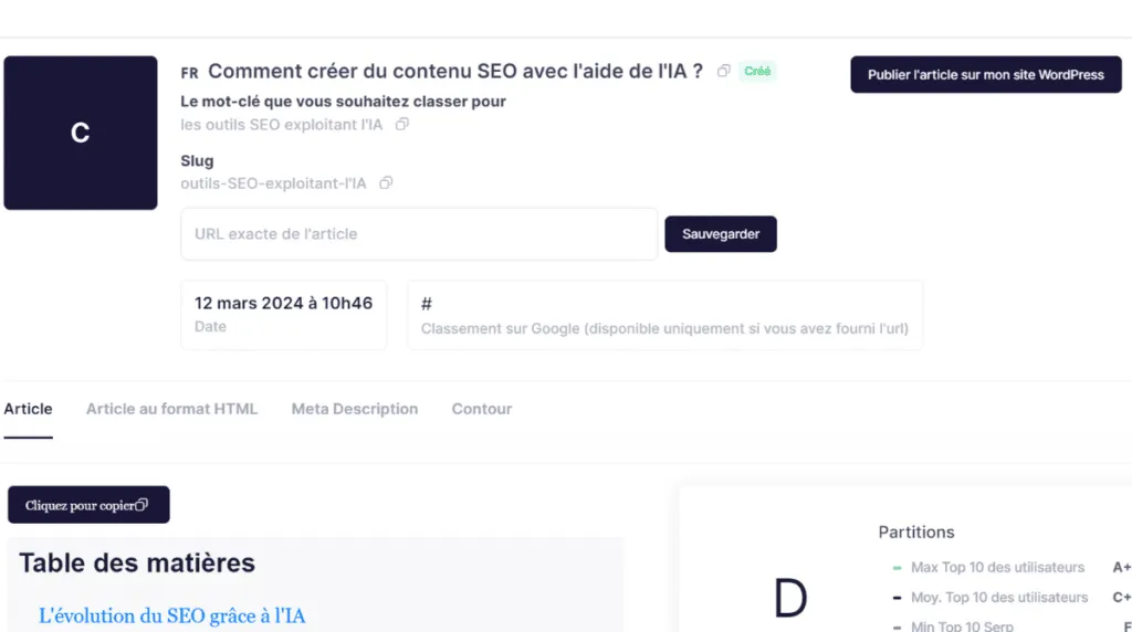L’outil propose un assistant basé sur l’intelligence artificielle pour générer, optimiser et suivre des contenus SEO. Plus de 1 000 rédacteurs et agences SEO l’utilisent quotidiennement. Il permet de créer des articles optimisés pour Google, en quelques étapes simples, afin d’améliorer la visibilité et le trafic organique des sites web.