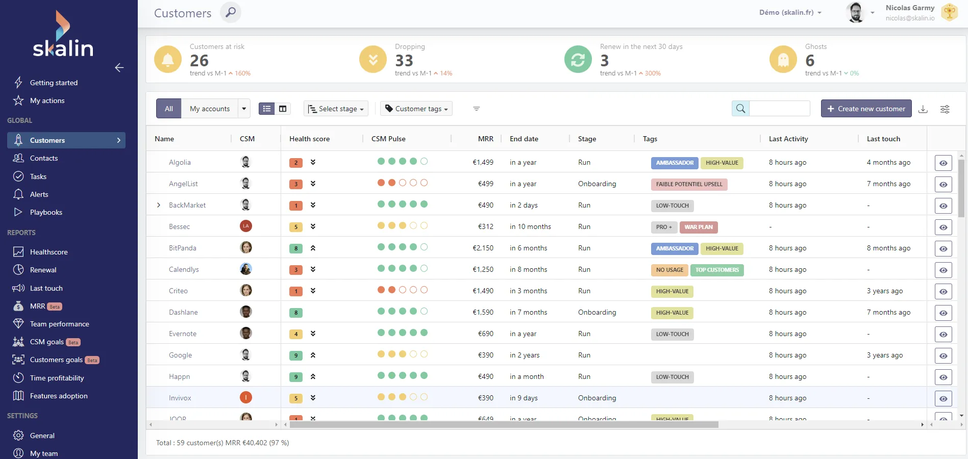 Un des points forts est l’utilisation d’algorithmes auto-apprenants pour analyser les données clients et détecter automatiquement les comportements à risque. Le score de santé, alimenté par l’IA, fonctionne dès le premier jour sans configuration préalable grâce à des KPIs pré-configurés. Cela permet de prioriser les actions à mener auprès des clients réellement à risque et de lutter efficacement contre le churn.