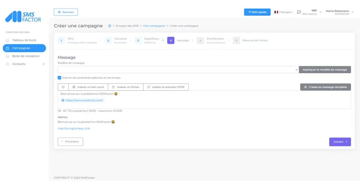Envoyer une campagne SMS via SMSFactor, c’est rapide et fluide. Vous commencez par sélectionner une liste de contacts, que vous avez soit importée, soit créée à partir de critères précis. Ensuite, vous rédigez votre message en le personnalisant pour chaque destinataire, avec des variables comme le prénom ou le lieu.
