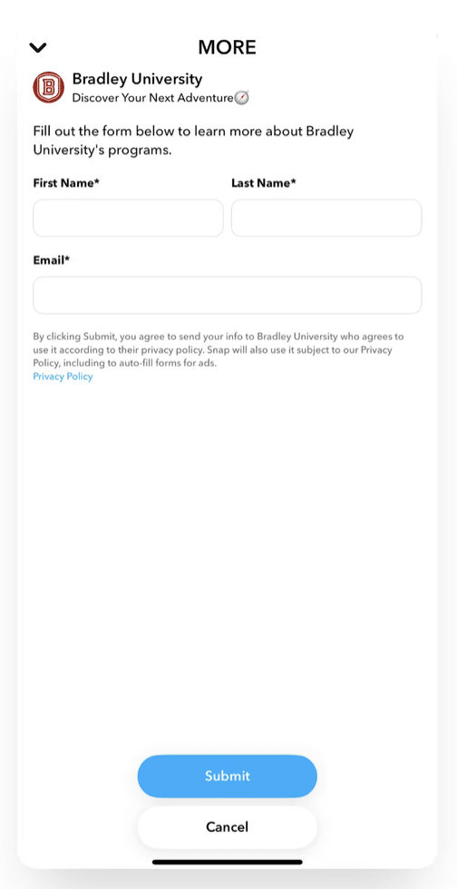 Au lieu d’envoyer les ados vers une landing interminable, l’université a utilisé les formulaires intégrés dans Snap Ads. Résultat : en deux swipes, le lead était qualifié. Nom, prénom, email → envoyé. Pas de chargement. Pas de clic en trop. Et un message qui matchait pile avec les attentes de la Gen Z : “Unlock your full potential. Whatever you do, Be You.”