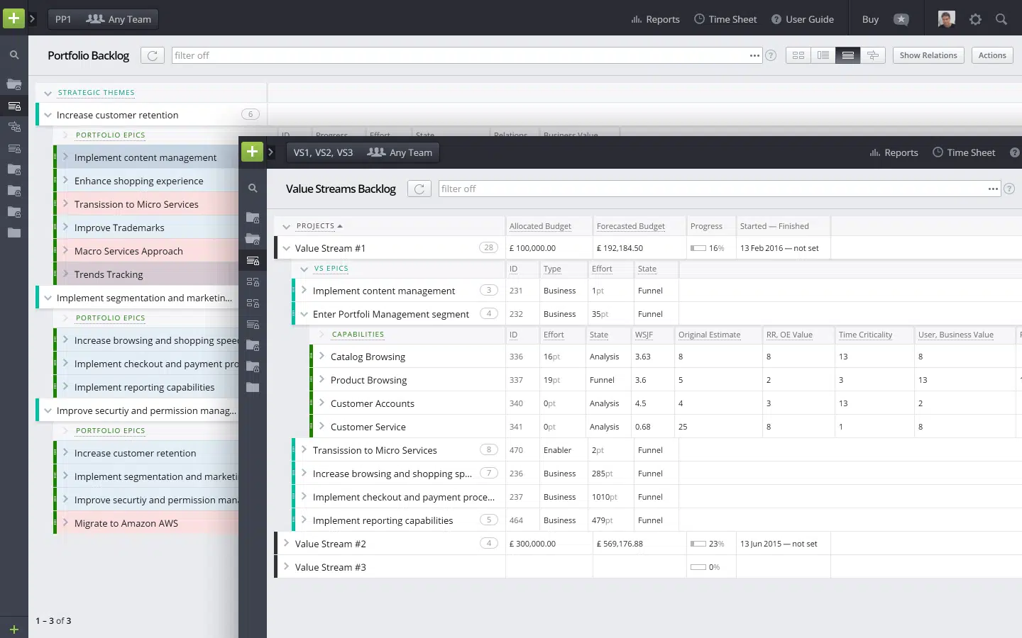 La solution connecte tous les niveaux de l’entreprise. Les dirigeants peuvent ajuster la stratégie et voir l’organisation s’aligner rapidement. Les gestionnaires de portefeuilles agrègent projets waterfall et programmes agiles vers les initiatives stratégiques. Les responsables produits gèrent la valeur du point de vue produit, tandis que les équipes agiles conservent leurs outils et méthodes tout en restant alignées sur la stratégie d’entreprise.