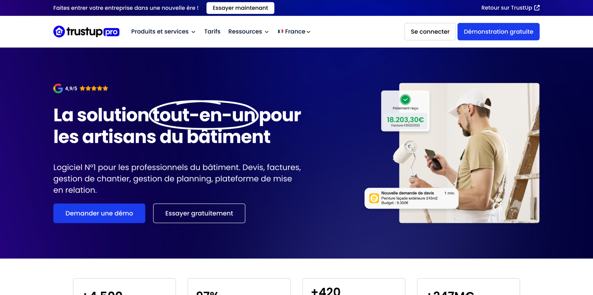 Avec TrustUp Pro, le devis et la facturation deviennent plus simples et efficaces. La plateforme est conçue pour répondre aux besoins des entrepreneurs du bâtiment en leur proposant des outils puissants pour optimiser le temps et éviter les erreurs. Il s’agit d’une solution moderne et intégrée qui facilite vos tâches administratives et qui vous permet de vous concentrer davantage sur le développement de votre activité. Essayez TrustUp Pro dès aujourd’hui et découvrez comment ce logiciel peut révolutionner votre manière de travailler !