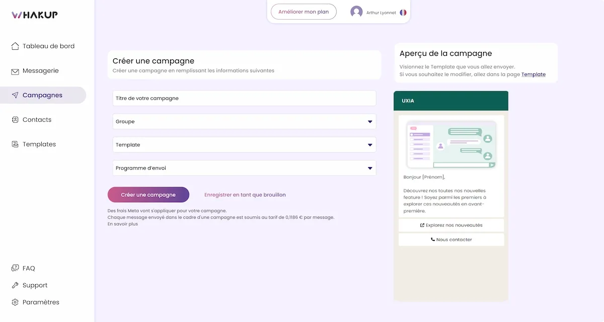 - Plan Basique : 30 €/mois, 2 utilisateurs, 10 000 messages/mois (hors coûts Metas), IA illimitée, extraction Excel, planification des envois, 90 jours de données