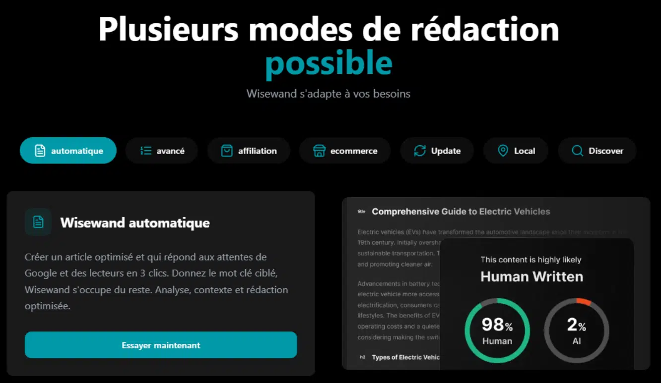 Si vous cherchez à produire du contenu optimisé rapidement et à moindre coût, Wisewand AI est une alternative sérieuse aux solutions classiques.