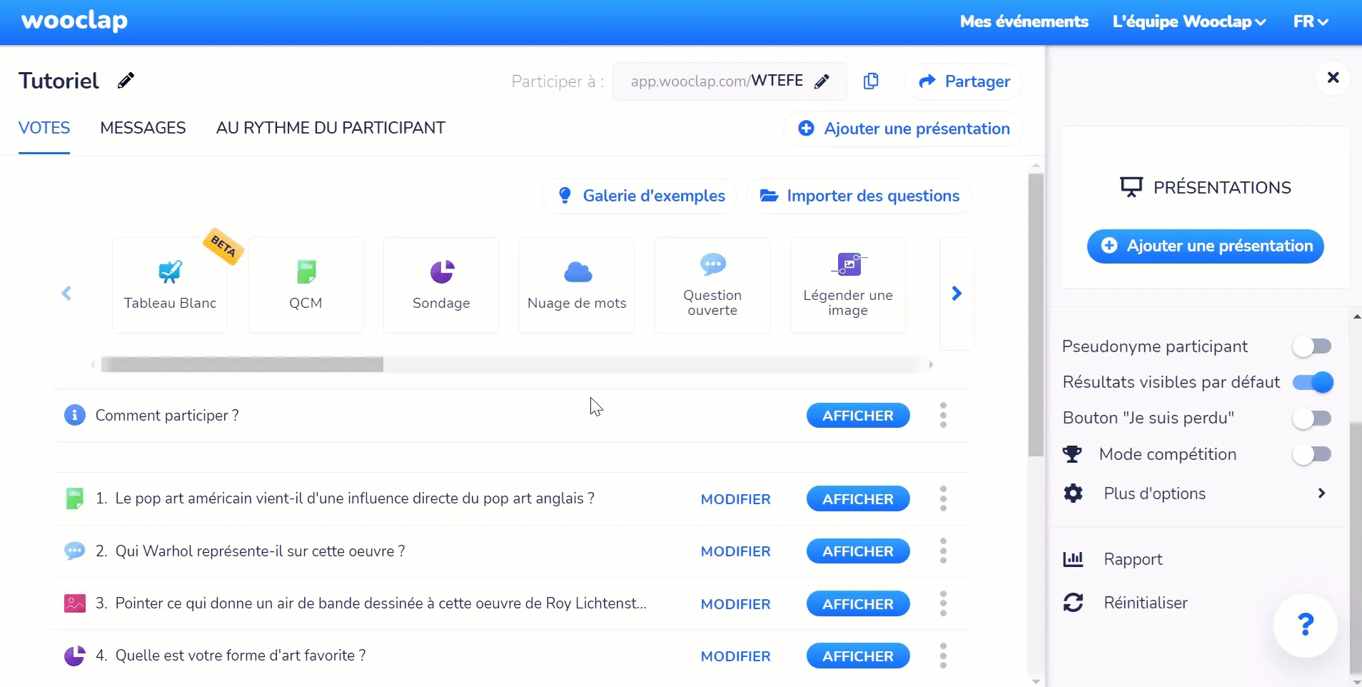 - Création de questions interactives (20 types disponibles, dont QCM, sondages, nuages de mots, questions ouvertes, quiz, brainstorming)