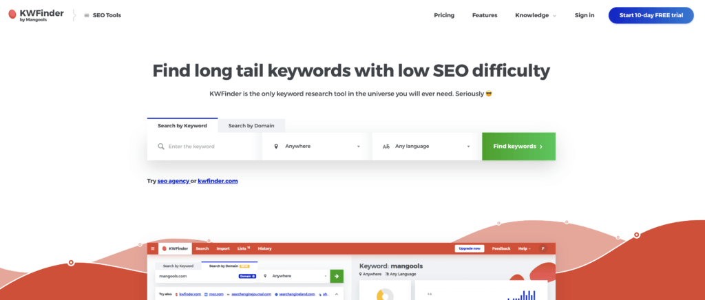 Tout comme Ubersuggest, KWFinder est une autre alternative Semrush totalement gratuite. Il n’exige pas non plus que vous créiez un compte, ce qui est un plus si vous voulez vraiment un outil sans engagement. Ce qui diffère, c’est le nombre d’options dont vous disposez lorsque vous lancez une recherche de mots clés. Alors qu’Ubersuggest vous permet uniquement de trouver des suggestions à partir d’un mot clé de départ, KWFinder vous permet également de rechercher spécifiquement des suggestions et des questions de l’autocomplétion de Google. Les suggestions de mots clés longue traîne sont également très bonnes.