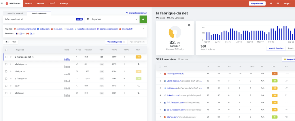En plus des mesures brutes comme le volume de recherche mensuel moyen, la difficulté et le CPC des mots-clés, KWFinder donne également les 10 premières pages qui se positionnent sur le mot clé analysé. Cela vous permettra de mieux évaluer la concurrence et peut-être de vous inspirer de leur contenu.