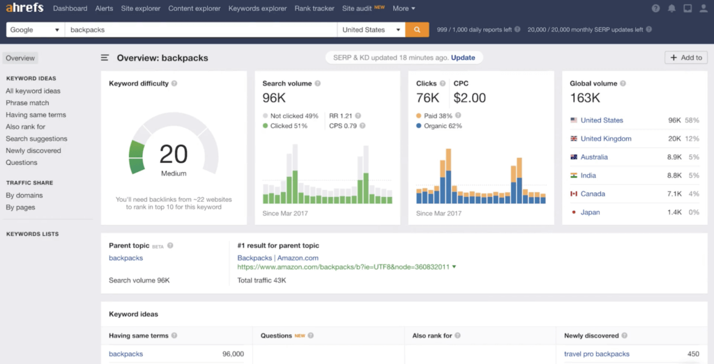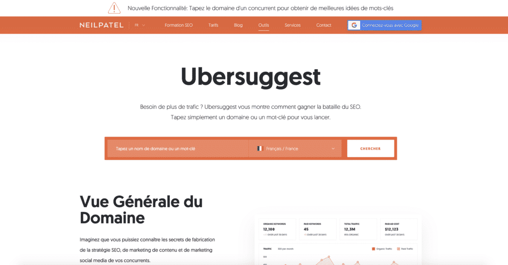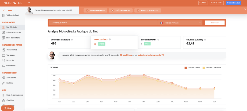 Hébergé sur le site de Neil Patel, Ubersuggest est ce que la plupart des blogueurs envisageraient comme un » outil gratuit « . Il possède toutes les fonctionnalités déverrouillées dès le départ, une interface conviviale et des capacités qui sont à la hauteur des outils haut de gamme. Vous n’avez même pas besoin de créer un compte pour utiliser Ubersuggest. Il vous suffit de lancer l’outil, d’entrer un mot-clé pour lancer le processus et de cliquer sur » Rechercher « . En quelques secondes, Ubersuggest affichera une vue d’ensemble des paramètres importants de votre mot-clé, y compris son volume de recherche mensuel moyen, sa difficulté de référencement et son CPC ou coût par clic moyen. Vous verrez également une estimation de votre taux de réussite si vous décidez de cibler le mot clé dans votre campagne de référencement.