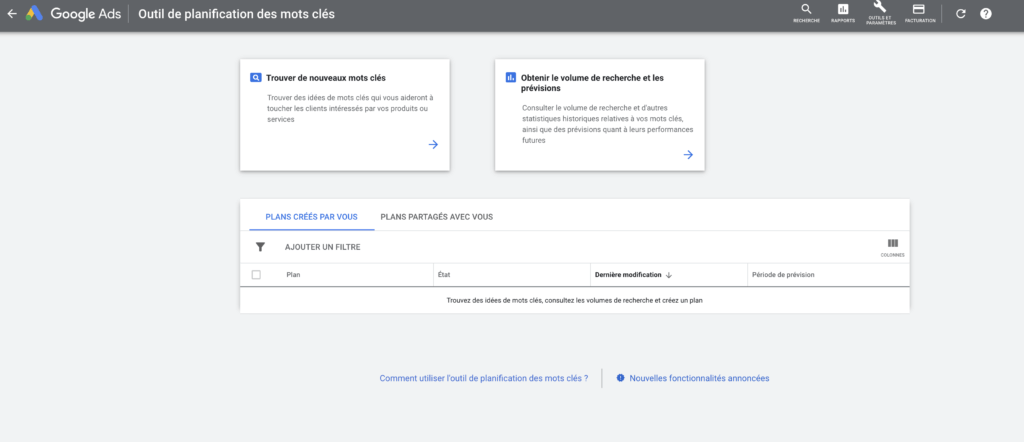Vous ne pouvez pas omettre le Google Keyword Planner lorsque vous cherchez les meilleurs outils de recherche de mot-clé gratuits. Comme vous l’avez peut-être deviné, vous devez avoir un compte Google avant de pouvoir utiliser Keyword Planner. Mais une fois que vous avez franchi cette étape, vous pouvez utiliser l’outil de recherche autant que vous le souhaitez. De plus, les entrepreneurs qui sont doués pour le marketing ont tendance à avoir un compte Gmail de toute façon, surtout pour les services et les réseaux comme YouTube, Google Drive et Google Analytics. Pour utiliser Keyword Planner, vous devez choisir entre trouver de nouvelles idées de mots clés ou obtenir des données sur le volume de recherche pour vos mots clés.
