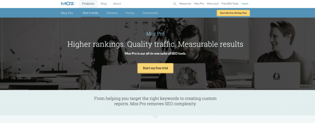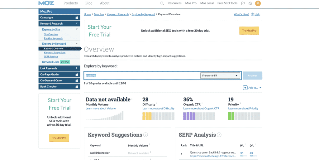 Moz Pro est un autre nom célèbre dans le monde du référencement et du marketing digital, en raison de son célèbre blog et de son système de notation DA / PA. Comme Ahrefs, tous les plans de Moz sont 0,95 dollars moins chers que Semrush (même moins cher si vous souscrivez à un plan annuel), il s’agit donc d’une autre alternative moins chère. En vous inscrivant à l’un des plans de Moz Pro, vous bénéficierez d’une session individuelle avec un véritable expert qui vous aidera à atteindre vos objectifs en matière de référencement.