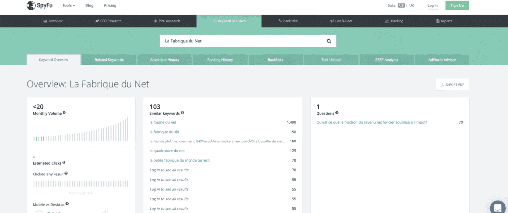 SpyFu est également relativement facile à utiliser, et en étant un client de SpyFu, vous pouvez également obtenir une pléthore de sources d’apprentissage.