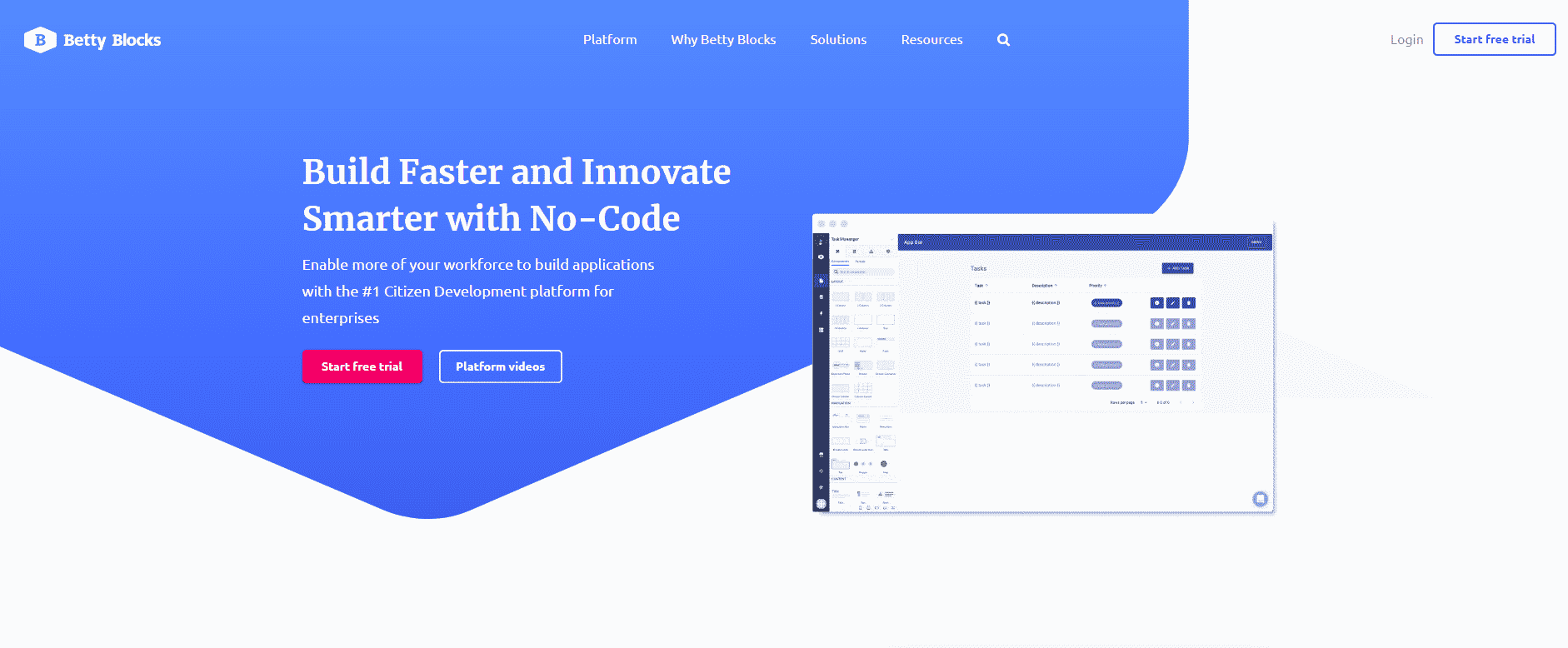 Betty Blocks fournit une plate-forme de développement sans code qui permet aux utilisateurs de concevoir et de créer des applications Web et mobiles sans codage traditionnel. La plate-forme prend en charge les intégrations de données telles que Google Drive, DropBox, Salesforce et d’autres plates-formes de feuilles de calcul et de bases de données basées.
