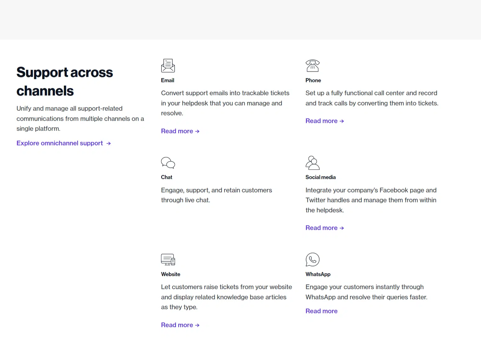 Freshdesk est connu pour son intégration cross-canal qui unifie toutes les communications liées à l’assistance sur une seule plateforme, provenant de canaux tels que l’e-mail, l’assistance téléphonique, le chat, les réseaux sociaux, le site Web et WhatsApp. Cela permet à l’équipe d’assistance de gérer tous les canaux à partir d’un seul endroit. Freshdesk utilise également l’algorithme d’attribution de chat en temps réel « Omniroute » pour nommer un agent de support en fonction des règles de gestion.