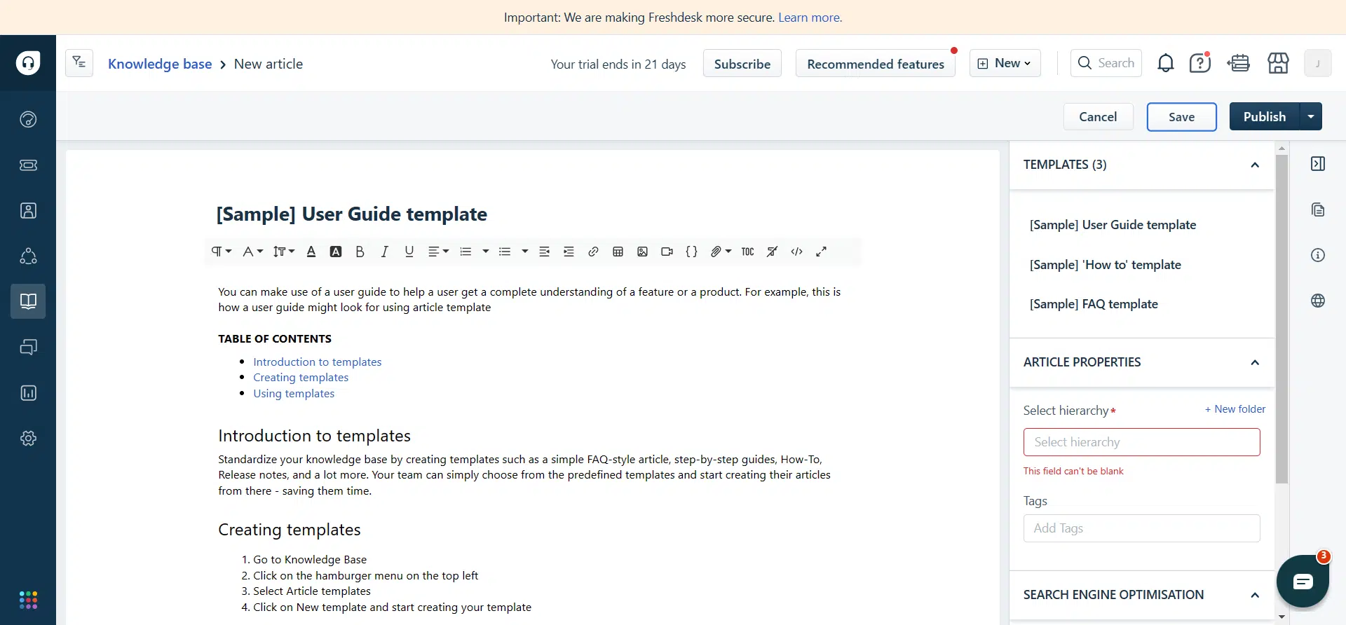 Freshdesk vous permet de créer votre base de connaissances et de l’intégrer à leur chat en direct. De cette façon, lorsque les clients viennent chercher une réponse, ils sont immédiatement référés aux articles de la base de connaissances déjà créés, ce qui réduit la charge sur les agents de support. Sur Freshdesk, vous pouvez développer un nouvel article de la base de connaissances avec l’éditeur intégré qui inclut également la fonctionnalité de recherche. Dans Freshdesk, une fonctionnalité de base de connaissances est incluse dans tous les plans.