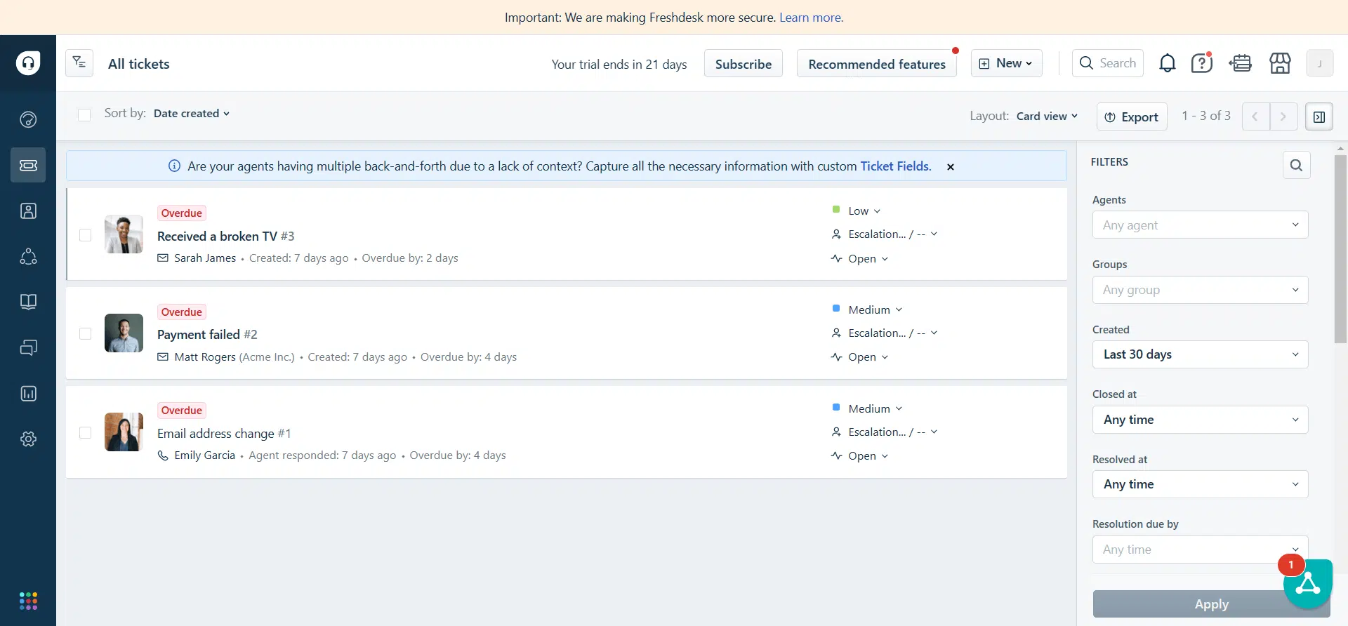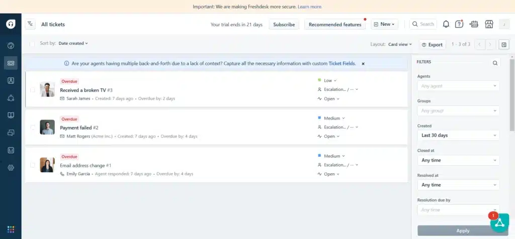 Système de ticketing intelligent : Avec Freshdesk, la gestion des requêtes client devient un jeu d’enfant grâce à son système de ticketing intelligent. Il organise automatiquement les tickets et les affecte au bon agent, permettant une réponse rapide et efficace.