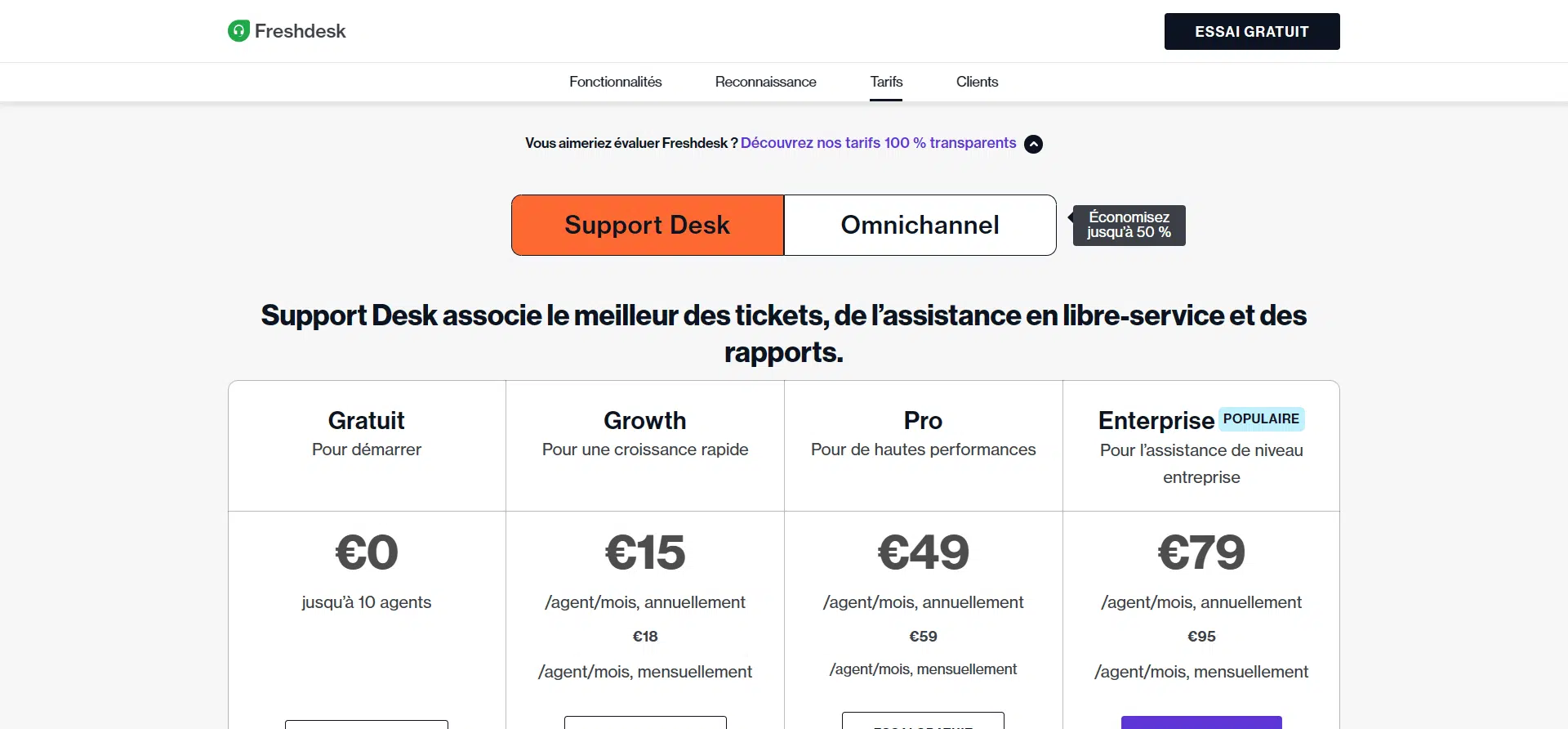 Freshdesk dispose de sept plans tarifaires, parmi lesquels se trouve une offre gratuite. Les trois premiers plans sont axés sur le support technique, à savoir Growth, Pro et Entreprise pour des tarifs qui s’étendent de 0 à 79 € / mois par agent. Les trois autres plans, appelés plans omnicanaux, comprennent également les options Growth, Pro et Entreprise pour des tarifs allant de 22 à 99€ / mois par agent.