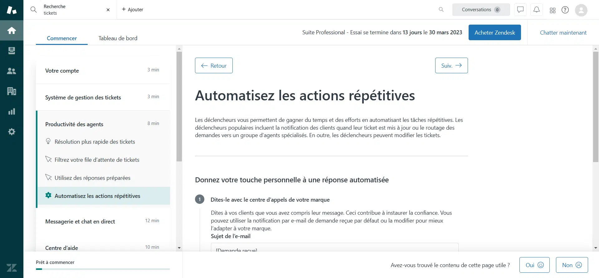 Zendesk est une plate-forme de service client qui permet aux entreprises de créer des flux de travail automatisés pour atteindre leurs objectifs commerciaux. Les utilisateurs peuvent définir plusieurs déclencheurs (règles d’automatisation) qui sont activés lorsque des événements prédéfinis se produisent. Cela aide les entreprises à traiter les demandes des clients plus rapidement et à améliorer leur satisfaction.