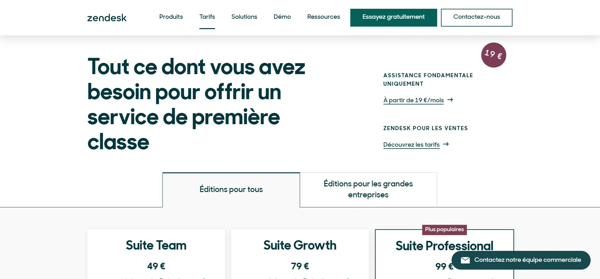 Le coût de Zendesk est en fait assez similaire à celui de Freshdesk, à l’exception du plan gratuit qui n’existe pas chez Zendesk. Zendesk propose cinq plans tarifaires différents, dont trois plans de support classiques et deux plans dédiés aux grandes entreprises.