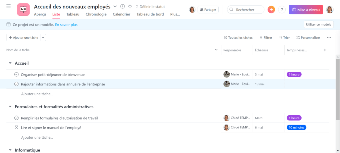Asana va plus loin en permettant également de gérer les processus internes de l’entreprise, en plus des projets. Vous pouvez formaliser et clarifier ces processus récurrents, comme l’accueil des nouveaux employés, en identifiant des tâches incontournables et en les utilisant comme modèle pour chaque nouvel arrivant :