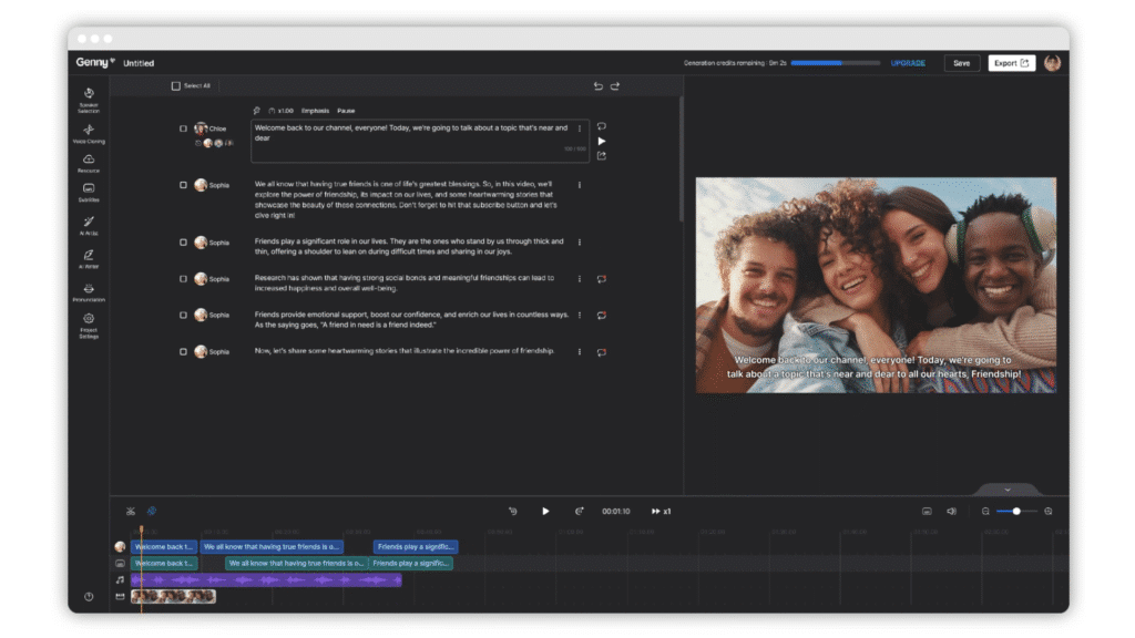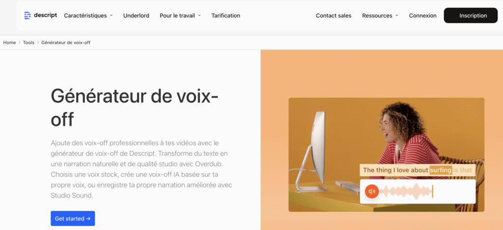 Descript est un générateur de voix off. Il fonctionne à partir d’un script. On peut choisir un style de voix ou cloner sa propre voix. Descript est également un outil de montage vidéo avec sous-titres et légendes.