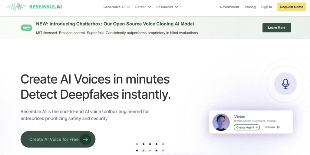 Resemble.ai a un double usage : créer des voix, mais aussi détecter les deepfakes. Pour assurer la sécurité des entreprises, elle détecte les manipulations dans les audios, les vidéos ou les images. Elle permet notamment de créer des agents vocaux dans différentes langues. Il est aussi doté d’un système pour modifier la voix et d’options de montage audio.