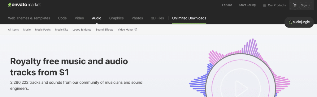 AudioJungle contient 1,3 million de pistes audio. Vous y trouverez des bruitages, des musiques et d’autres sons. Des packs de sons ou des kits pour construire vos propres pistes sonores y sont aussi proposés ainsi que des fichiers sources. Les artistes peuvent vendre leur musique directement sur la plateforme. Elle est destinée aux professionnels. Le coût d’acquisition d’un morceau dépend de la licence associée.