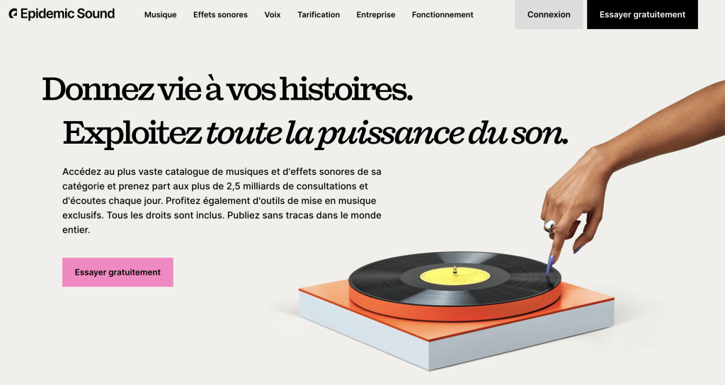 | Epidemic Sound | Pour une utilisation sur YouTube et les autres réseaux sociaux | Catalogues dynamiques, effets inclus | Usage sur réseaux sociaux, sur le web, entreprise, dans les publicités numériques selon l’abonnement | Abonnement entre 9,99 € et 16,99 €/mois, essai de 30 jours offert |