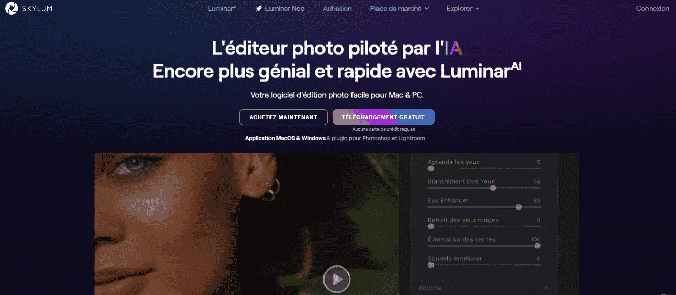 Skylum Luminar est une solution de gestion et d’édition d’images puissante et riche en fonctionnalités avec des outils de retouche uniques non disponibles ailleurs à un tarif relativement abordable. Ce logiciel utilise l’intelligence artificielle pour produire des modifications réalistes et non destructives des images RAW et JPEG sur Mac et PC, y compris l’amélioration du portrait, le remplacement du ciel et d’autres outils sensibles au contenu. Facile à apprendre et très amusant.