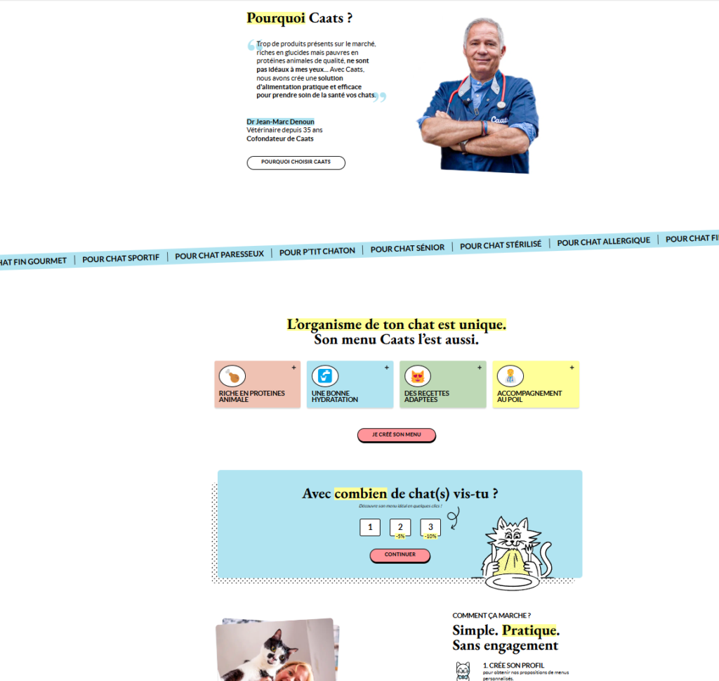 Voici un exemple particulièrement efficace, qui combine professionnalisme (expertise vétérinaire), personnalisation (adapté à chaque chat) et simplicité d’utilisation (parcours clair vers l’engagement).