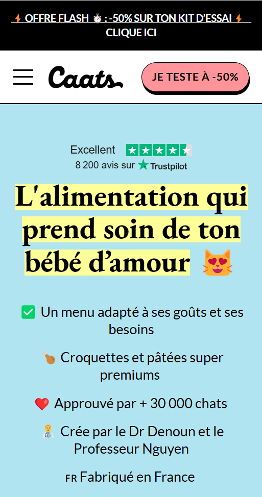 - Message principal « L’organisme de ton chat est unique. Son menu Caats l’est aussi. »