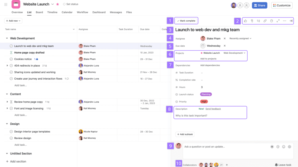Avec Asana, vous suivez l’avancement des projets grâce à des vues en liste, tableau ou calendrier, qui facilitent la coordination des équipes. Découvrez notre avis sur Asana.