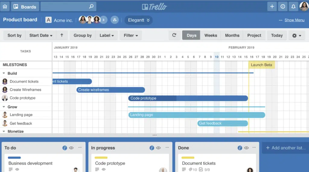 Trello est parfait pour la simplicité, et devient apte au retroplanning avec une extension gantt comme Planyway ou Big Picture. L’interface de type kanban reste accessible, tandis que la chronologie et les dépendances apportent la rigueur nécessaire aux délais.