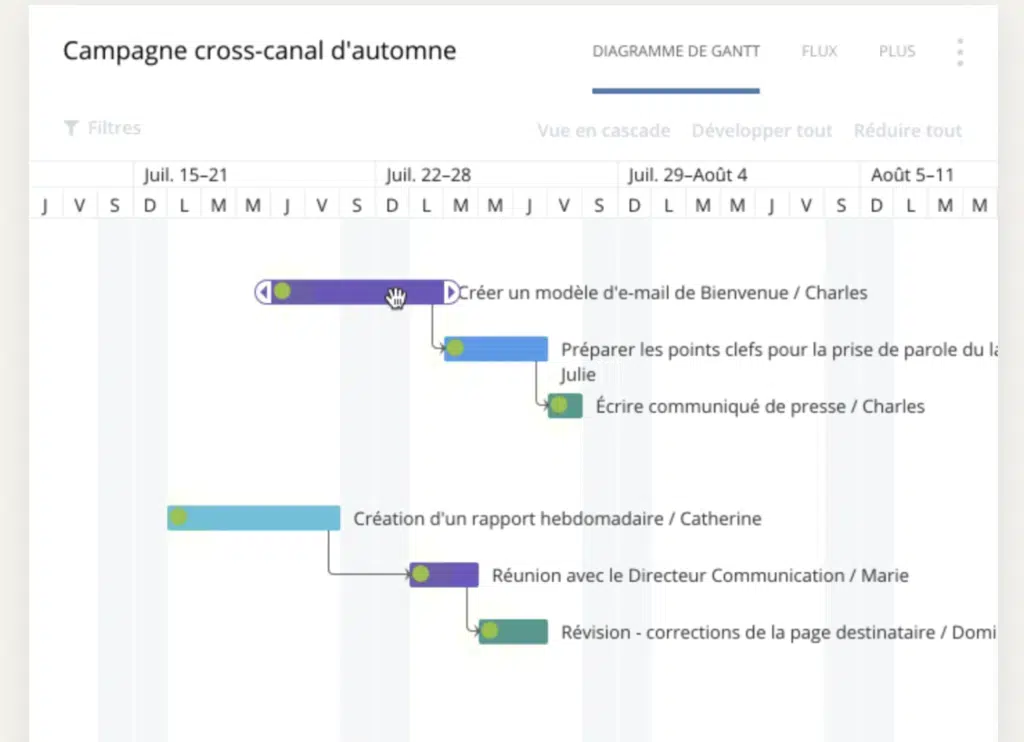 - Diagramme de gantt fluide, lisible et interactif (glisser-déposer, zoom temporel, jalons).