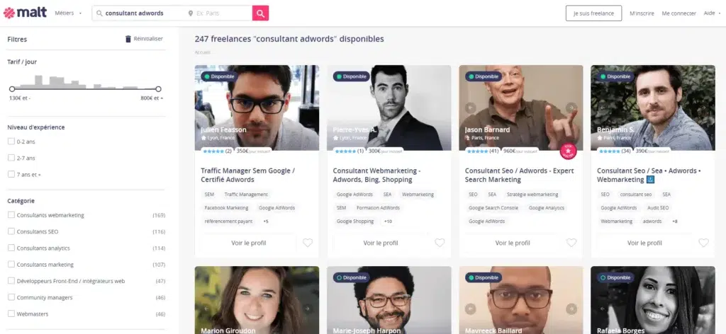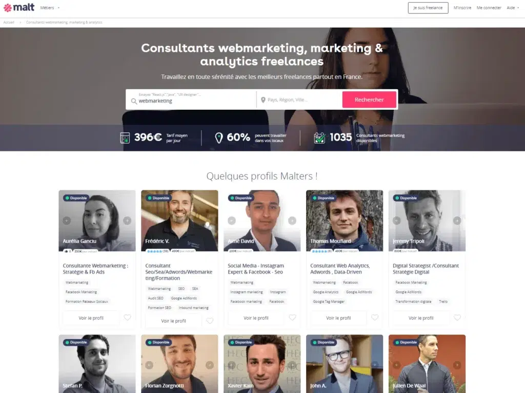 Malt, qui s’appelait auparavant Hopwork, est sans doute aujourd’hui la plateforme de freelances de référence sur le marché français. Près de 50 000 freelances y sont inscrits. Tous les métiers du digital sont représentés : développeurs, data scientists, chefs de projet, rédacteurs, community managers, administrateurs systèmes, consultants stratégie, graphistes, designers, consultants web, webmarketing, analytics, etc. Malt propose un système de filtres très bien fait pour vous aider à sélectionner les freelances les mieux en mesure de correspondre à vos besoins.
