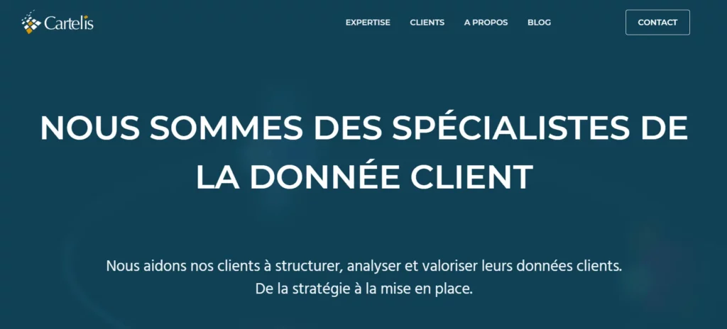 Cartelis se définit comme un spécialiste de la donnée client. Cabinet de conseil en stratégie digitale très orientée data et à forte culture entrepreneuriale, Cartelis intervient essentiellement sur deux univers :