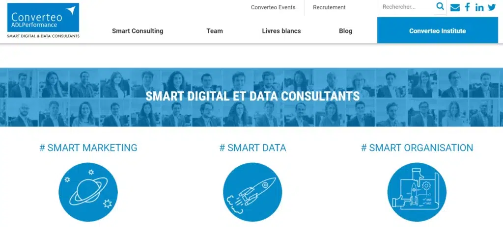 Fondé en 2007, Converteo est un cabinet de conseil en stratégie digitale spécialisé dans les activités liées à la webanalyse. Les services proposés par ce cabinet couvrent l’ensemble de la chaîne de valeur data : collecte, modélisation, exploitation. Converteo, qui cible prioritairement les grandes entreprises et les ETI, a développé une connaissance experte des outils technologiques permettant d’optimiser l’exploitation des données et la performance marketing (DMP, datalakes, analytics, A/B tests, attribution…). La croissance de ce cabinet est impressionnante. Converteo, c’est aujourd’hui plus de 90 consultants web.