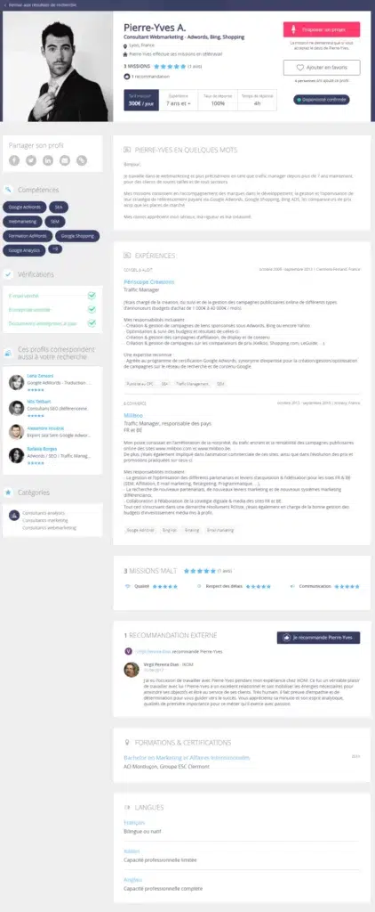 Les pages profil sont elles-mêmes très riches. On y trouve une description souvent très complète du freelance, la liste détaillée de ses expériences et ses recommandations par les clients de Malt. Malt se rémunère en prélevant une commission sur les factures des freelances. Citons aussi la plateforme Freelance, qui fonctionne sur le même principe.
