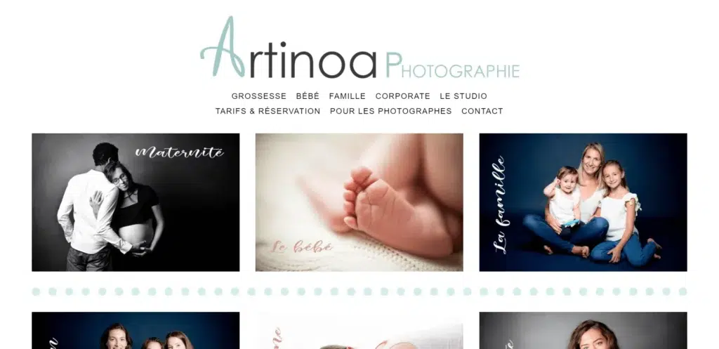 Artinoa a misé sur les catégories de photos pour diriger ses visiteurs vers la rubrique la plus pertinente en un seul clic. Par la même occasion, la mosaïque de photo qui mène à chaque rubrique, permet de donner un rapide aperçu des compétences de cette photographe dès la page d’accueil.