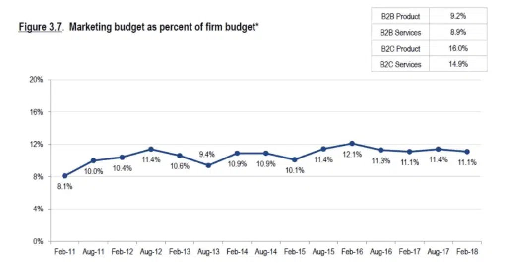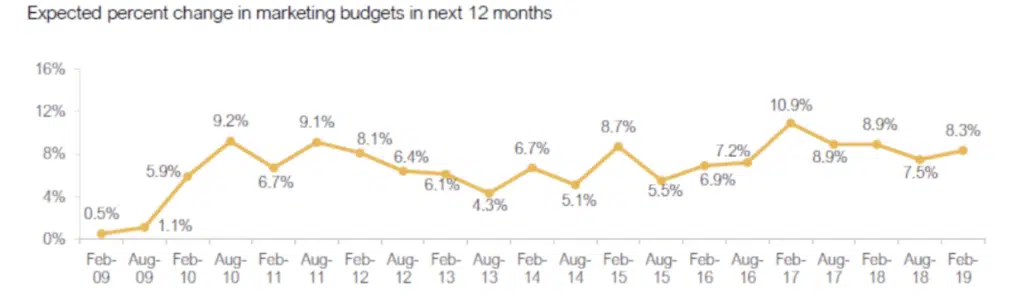 A l’heure actuelle, le marketing est une branche essentielle de l’entreprise. En effet, c’est ce qui permet de mettre des actions clés en place en matière de communication et d’acquisition client. Il est important de noter que depuis 2009, cette dépense n’a jamais baissé au sein des sociétés. En effet, cette dernière est restée stable ou a même tendance à augmenter: entre 2017 et 2019, la variation est entre 7.5% et 8.9%.
