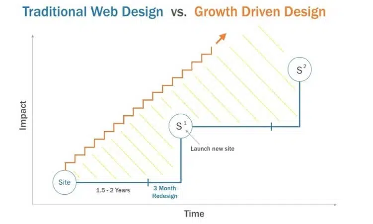 Mais le vrai problème est qu’il n’est pas conçu pour générer du trafic, des prospects et des ventes pour votre entreprise. C’est pourquoi le processus de conception de sites web traditionnels est rompu. La bonne nouvelle est qu’il existe une approche plus intelligente de la conception de sites web. Nous appelons ce processus Growth Driven Design (GDD). GDD se concentre sur l’utilisation de données réelles pour diriger le processus de conception et pour conduire une amélioration continue.