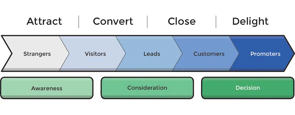 Transformer des étrangers en visiteurs, prospects, clients et promoteurs de votre entreprise, voici le but recherché. La dernière ligne sont les étapes du voyage d’achat.