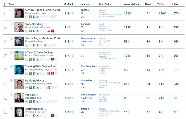 Pour cibler des bloggers, vous devez commencer par identifier les blogs qui traitent de votre domaine, de votre thématique, de votre secteur d’activité. Ciblez les blogeurs qui ont une audience consistante ET qui publient des contenus riches et intéressants. Créez un document (un spreadsheet par exemple) listant les blogeurs dans votre domaine. Nous vous conseillons d’utiliser un outil Inkybee (capture d’écran), BlogDash ou Buzz Stream pour générer automatiquement les statistiques SEO et social media de chaque blogeur. Cela vous permettra d’identifier les influenceurs à plus fort potentiel et de prioriser vos prises de contact.