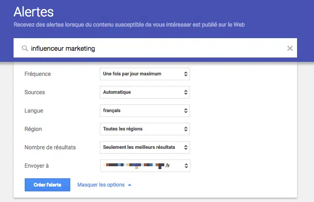 Nous vous recommandons aussi d’utiliser Google Alertes. Ce service est gratuit et permet de recevoir une notification par email à chaque fois qu’une personne publie sur internet un nouveau contenu sur votre entreprise ou sur votre niche.