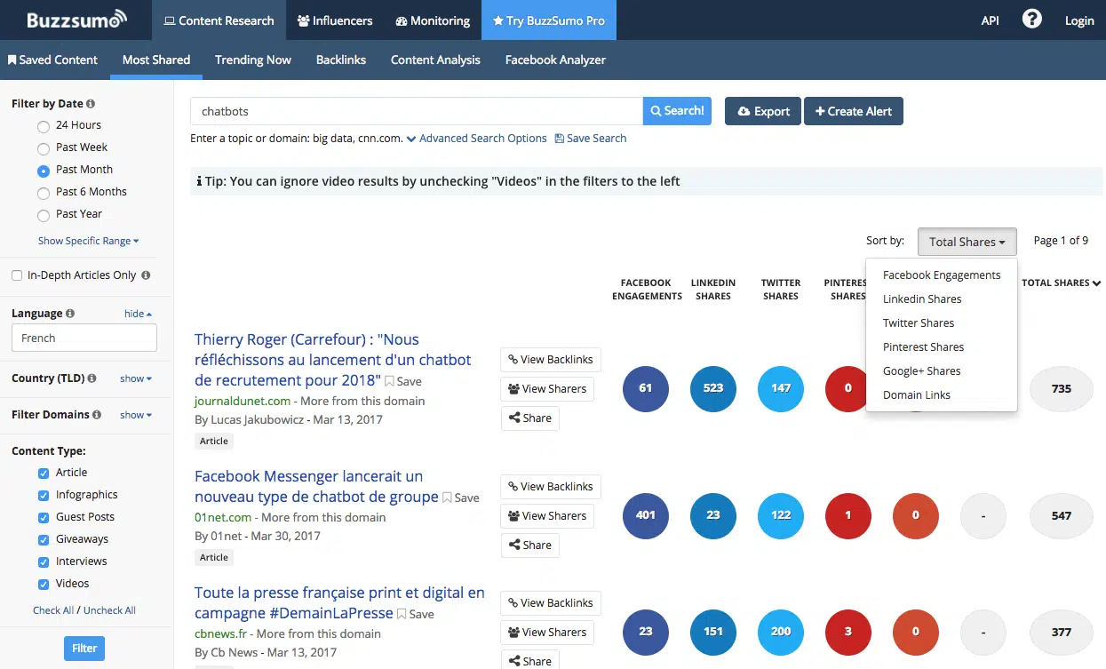 Voici un dernier outil utile pour votre monitoring : Social Mention qui permet d’identifier toutes les mentions de votre marque sur les principaux réseaux sociaux (YouTube, Twitter, Facebook), sur les blogs, sur les sites communautaires et forums, etc. N’oublions pas non plus de mentionner un outil comme BuzzSumo, qui permet de mesurer le pouls sur les réseaux sociaux, d’identifier les contenus qui font le buzz, par catégorie, par réseau social, par thématiques, etc.