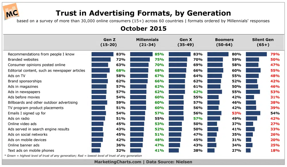 Ce tableau (source : Nielsen) montre que les recommandations et les contenus éditoriaux ont beaucoup plus d’impact que la publicité traditionnelle (inbound marketing vs outbound marketing) :